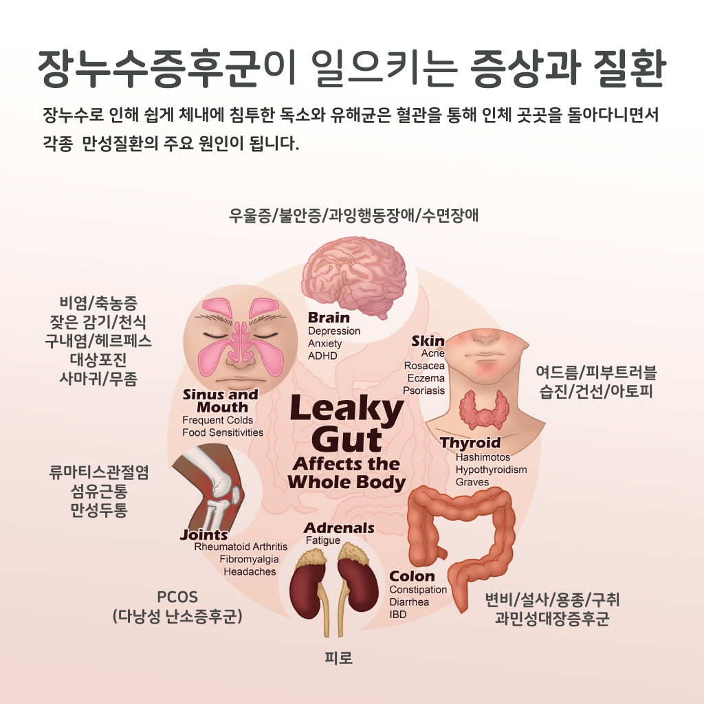 장누수증후군은 장 세포가 손상되거나 세포 사이에 작용하는 단백질에 의해 장 내벽에 미세한 구멍이 생기는 질환입니다. 장은 음식물의 소화, 흡수, 배설의 기능 외에도 미생물이나 독소 등의 외부 유해물질의 유입을 차단하는 방어벽 역할도 합니다. 장내 미생물 불균형으로 인해 장 점막에 염증이 생기고, 점막 세포를 연결하고 있는 치밀결합조직이 약해지면 몸에 좋지않은 성분들이 그대로 투과되어 면역반응이 발생하게 됩니다.
