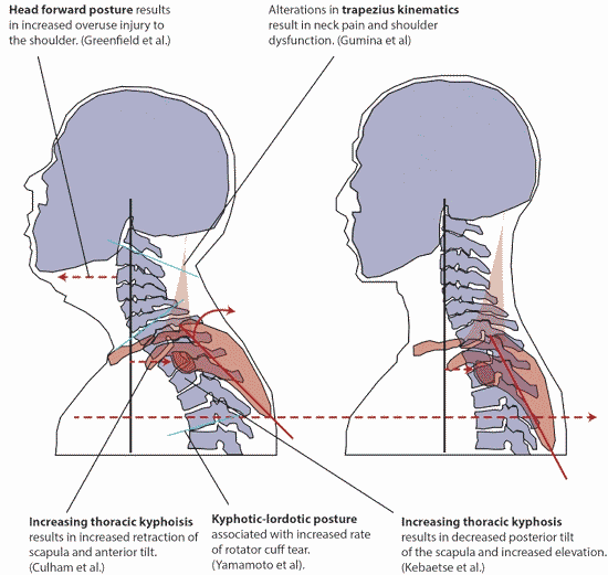 스마트폰 및 컴퓨터 사용을 위해 목을 앞으로 빼고 어깨를 움츠린 자세를 오래 취하다보면, 경추의 정상 C커브가 무너져, 일자형태로 배열되는 일자목이 생기게 됩니다. 또한, 흉추의 전만은 더 심해져 굽은등이 되고, 어깨는 전방으로 둥글게 말리는 라운드숄더가 생기게 됩니다.