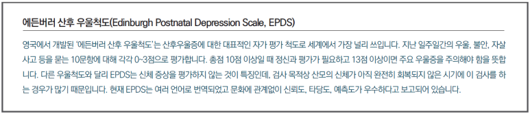 ● 분만 후 우울증은 산후 우울감(Postpartum blues)과 구별되어야 합니다. 산후 우울감은 울음, 슬픔, 짜증, 불안, 혼란과 같은 증상이 나타나지만 분만 후 4일경을 정점으로 하여 열흘 정도 지나면 자연스럽게 사라지는 일시적인 기분 장애로 지속적인 영향을 미치지 않습니다.