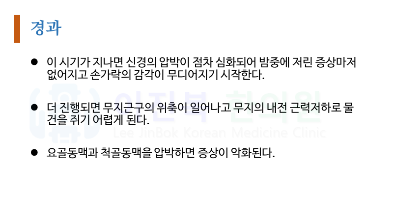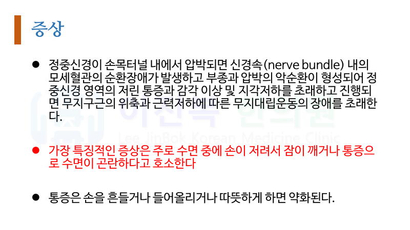임상적으로 한의원에 내원하시는 분들은 손바닥 전체가 저려서 자다 깬다고 표현을 많이 합니다.