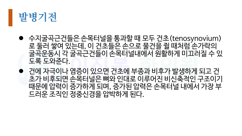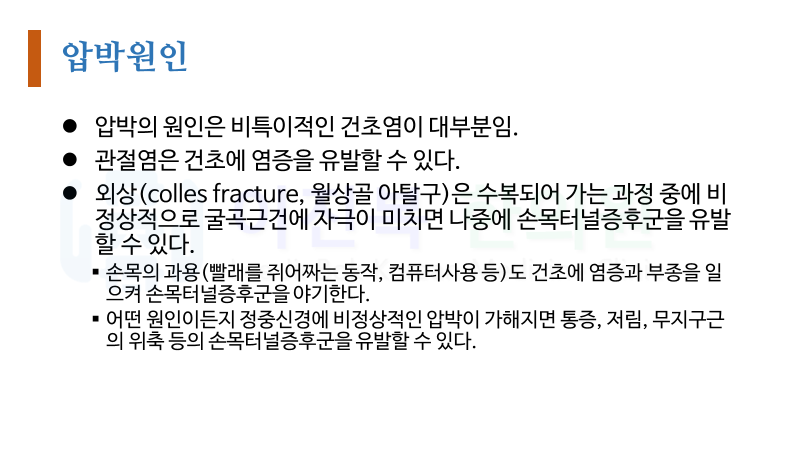 오늘은 정중신경의 압박으로 발생하는 손목터널증후군(수근관증후군)에 대해 설명해보겠습니다.