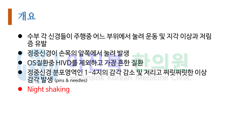 임상적으로 한의원에 내원하시는 분들은 손바닥 전체가 저려서 자다 깬다고 표현을 많이 합니다.