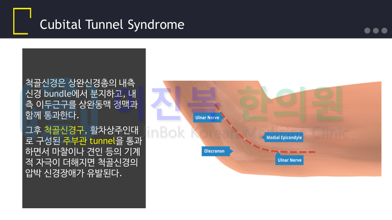 손가락 4,5지로 저림이나 불편감을 호소하며 경추 디스크로 오인하는 경우가 많습니다.