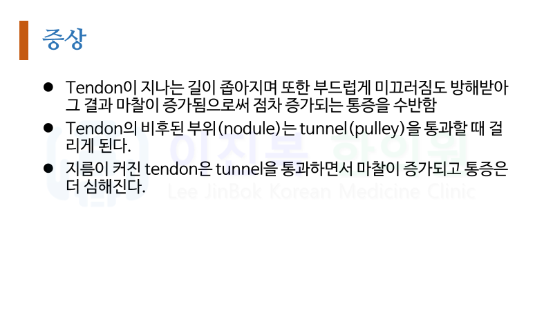 그러나, 반복 과사용으로 인한 유착성 통증에는 침도 요법을 시행하게 됩니다.
