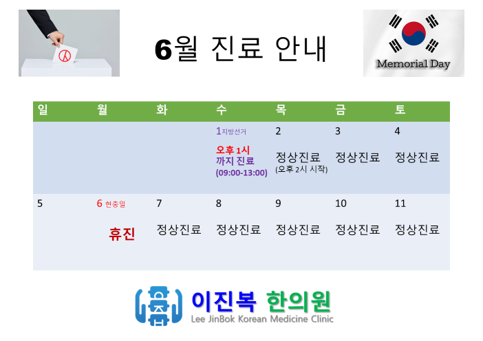 선거 당일에는 토요일처럼 오후 1시까지 점심시간 없이 진료예정이고, 현충일은 휴진 예정입니다.