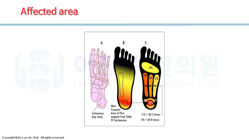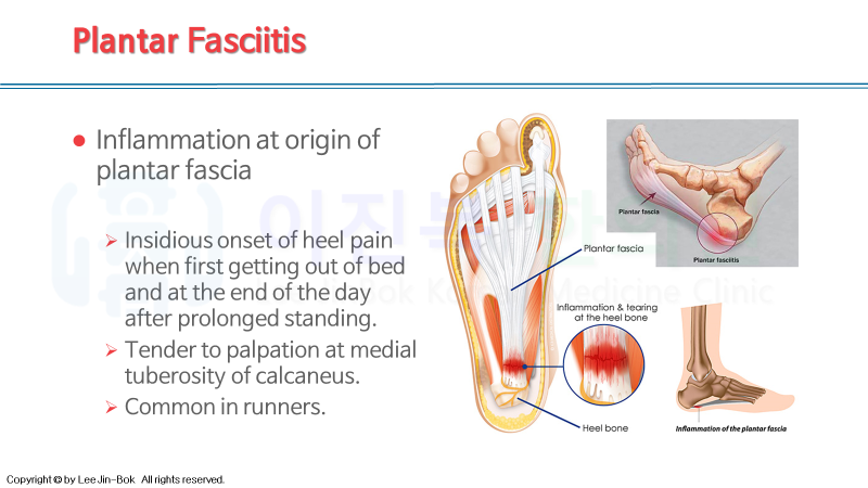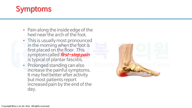 "first step pain"이라는 말에서 알 수 있듯이, 아침 기상 후 첫발을 디딜 때 제일 통증을 많이 느끼고, 시간이 지나 걷다보면 근막이 이완되면서 통증이 덜하게 됩니다.
