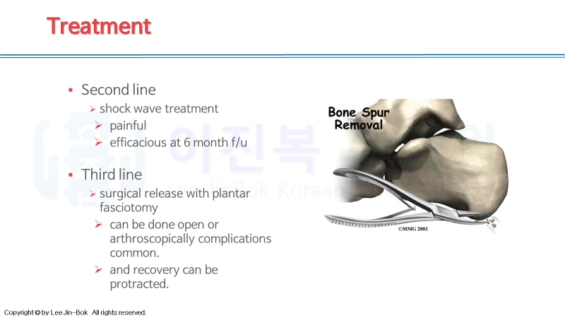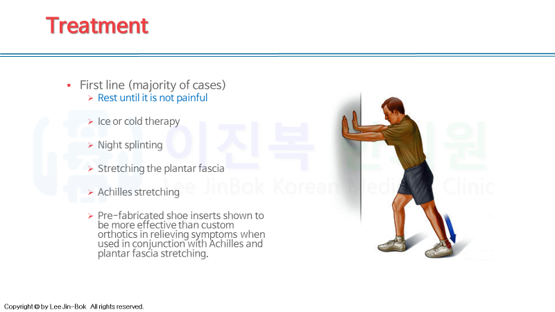 초기에는 염증을 제거하기 위한 전침, 약침치료가 우선되고, 이환 기간이 길어지고 호전 악화가 반복되었다면, 유착 박리를 위한 침도 요법과 비복근을 풀어주는 스트레칭이 무엇보다 중요합니다.