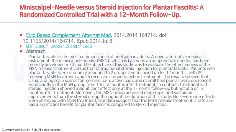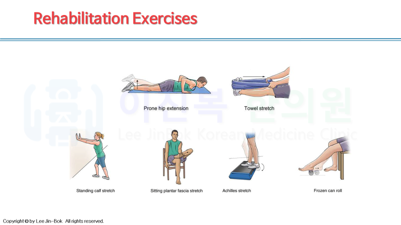 초기에는 염증을 제거하기 위한 전침, 약침치료가 우선되고, 이환 기간이 길어지고 호전 악화가 반복되었다면, 유착 박리를 위한 침도 요법과 비복근을 풀어주는 스트레칭이 무엇보다 중요합니다.