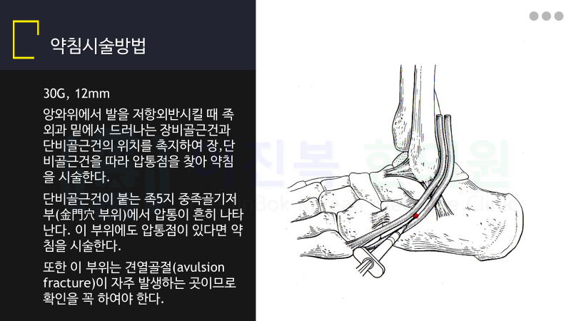 장비골근이나 단비골근의 통증유발점에 침 치료를 시행합니다.