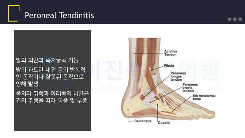 오늘은 발목 염좌로 인해 2차적으로 많이 발생하는 비골근건염에 대해 알아보겠습니다.