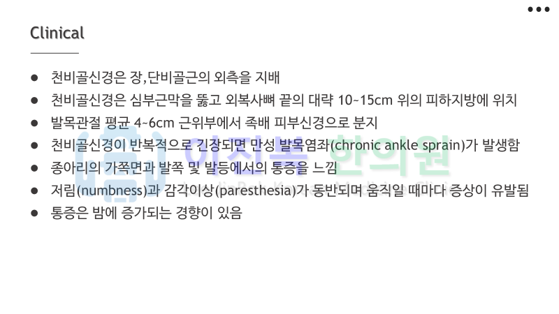 오늘은 비골신경 중 마지막인 천비골신경의 포착 증후구군에 대해 알아보겠습니다.