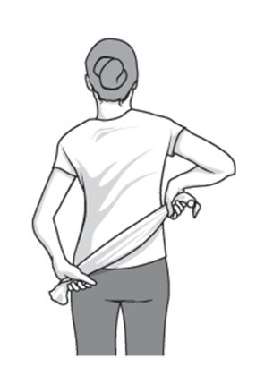 1m 정도의 길이의 수건의 한쪽 끝을 등뒤, 골반 근처에서 잡고 반대쪽 끝을 건강한 팔로 잡아주세요. 손의 위치를 골반근처에 고정한 상태에서 건강한 팔로 위로 당겨 스트레칭 해주세요. 증상이 호전되면 건강한 팔쪽 수건을 어깨 위에서 잡고 환측 팔을 등쪽으로 당겨 스트레칭해줍니다(우측사진). 하루 10-20회 정도 반복합니다.