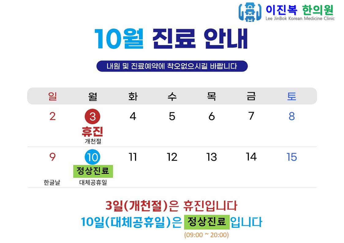 3일 개천절은 휴진하고, 10일 대체공휴일은 야간까지 정상 진료합니다.