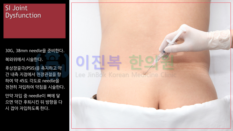 전침 및 약침 치료를 우선적으로 시행하고, 골반의 불균형이 있다면 추나 치료를 겸합니다.