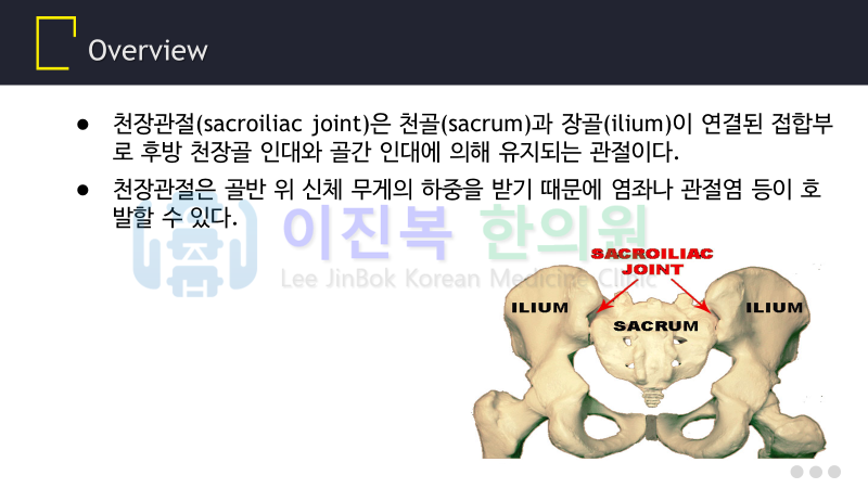 오늘은 천장관절의 기능 부전으로 발생하는 천장관절 증후군에 대해 알아보겠습니다.