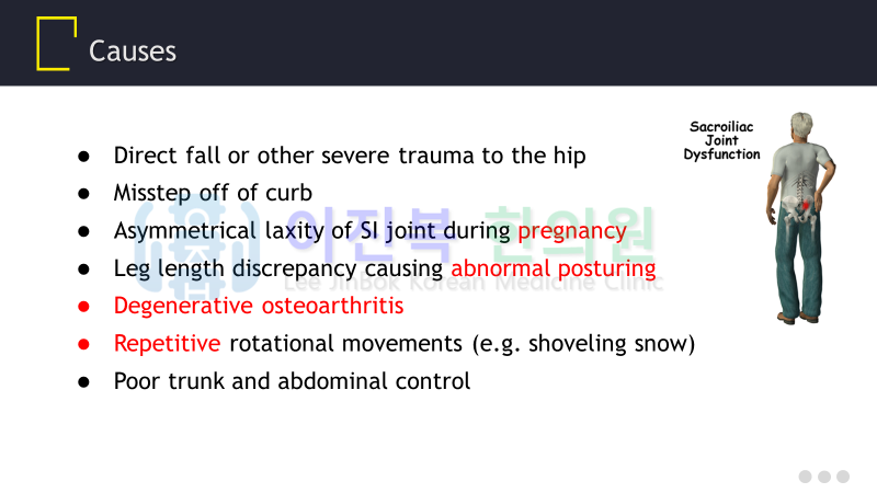 오늘은 천장관절의 기능 부전으로 발생하는 천장관절 증후군에 대해 알아보겠습니다.