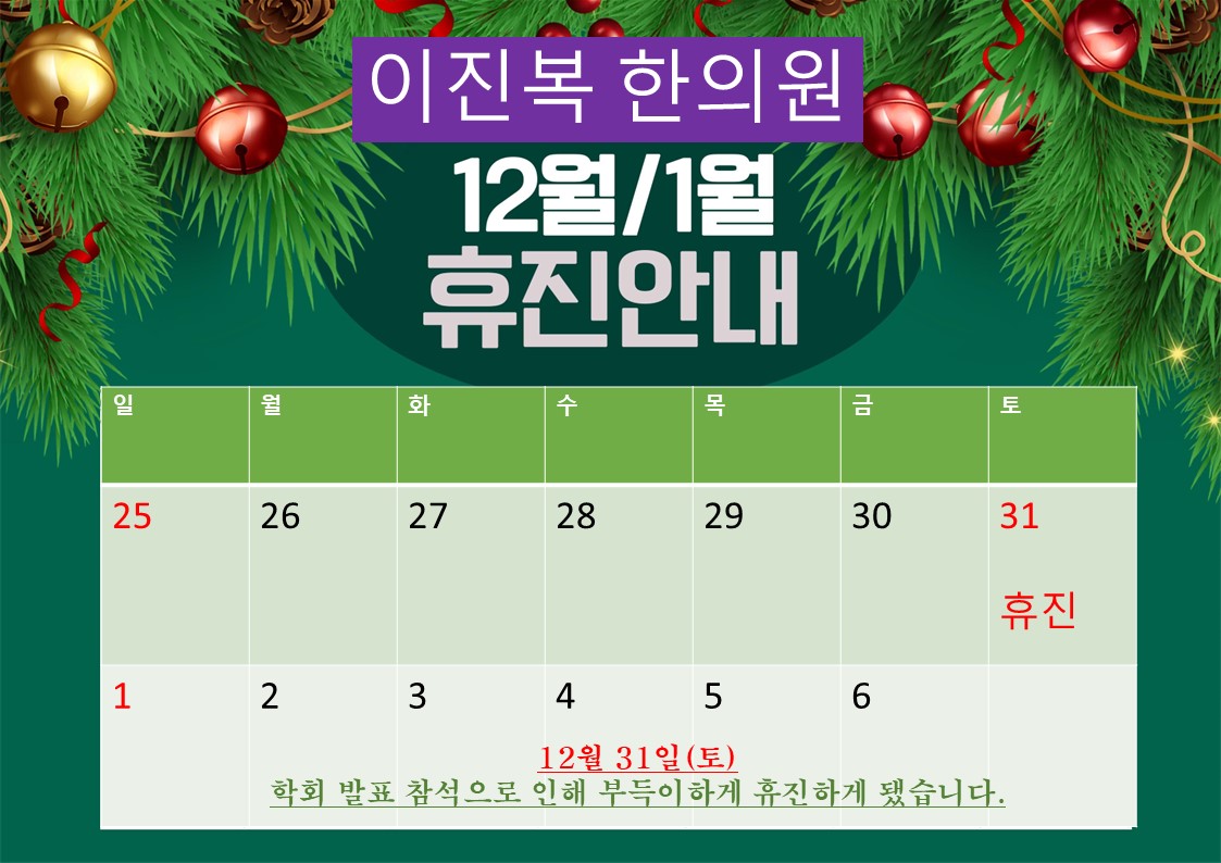 연말 12월 31일(토) 부득이하게 휴진을 해야할 것 같습니다.