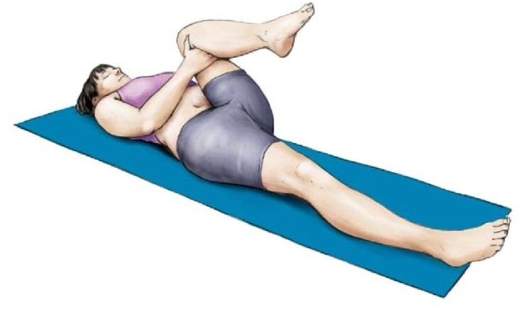 한쪽 무릎을 굽히고 양손으로 무릎 아래를 감싸 가슴 쪽으로 잡아 당긴다. 이 자세로 15초 이상 가능한 한 유지합니다. 운동 시 엉덩이가 과도하게 들리지 않도록 유의합니다.