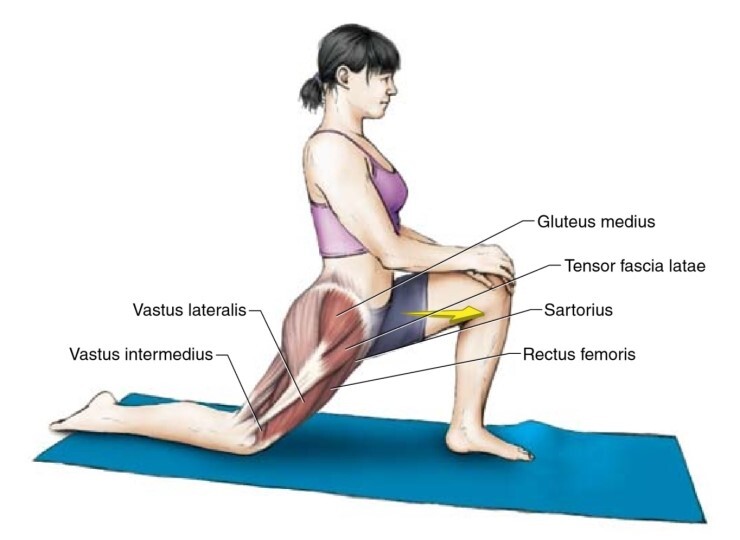 한쪽 무릎을 직각이 되게 세우고, 반대쪽 다리를 뒤로 길게 뻗습니다. 양손으로 바닥을 밀면서 골반을 서서히 아래로 누릅니다. 이 자세로 좌우 1회씩15초 이상 가능한 한 유지합니다.