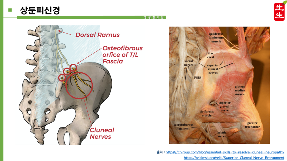 상둔피신경은 감각신경으로 L1-3 신경 후지(dorsal rumus)에서 기시하여 6개의 고정점을 거쳐 둔부와 괵부로 내려가는 신경입니다. 상둔피신경은 장골능(iliac crest)을 지나 엉덩이의 윗부분의 근육과 피부 감각을 지배합니다. 상둔피신경은 신경압박에 취약한데, 장골능을 지나가면서 더 쉽게 압박에 노출되기 때문입니다. 신경의 출구와 입구점에 형성된 골섬유관(osteofibrous tennel)이 손상되어 포착이 발생하면 둔상피신경의 압박증상이 발생합니다. 상둔피신경의 압박은 잘 낫지 않는 요둔통, 하지통의 숨은 원인입니다.