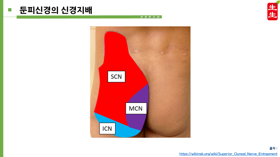 한의원에 오는 환자군들 중 많은 분들이 요통을 호소합니다. 그리고 요통 환자분들 중 많은 분들이 둔근에 통증이나 불편함을 호소합니다. 특히 그림의 빨간색 영역에 통증이나 불편감을 느낀다면 상둔피신경(superior cluneal nerve)의 포착을 의심해보아야 합니다.