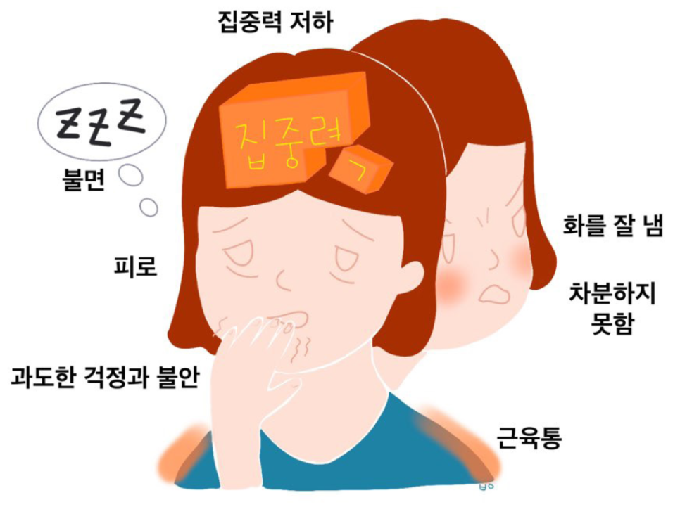 3. 집중하기 힘들거나 머릿속이 하얗게 되는 것 4. 과민성 5. 근육의 긴장