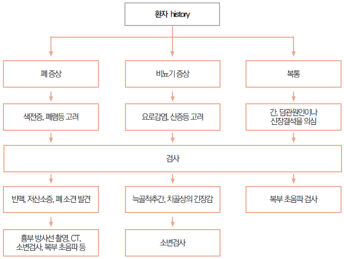 - 여성의 경우 월경력, 산부인과 증상 문진하여 임신 가능성, 산부인과 질환을 같이 염두해야 합니다