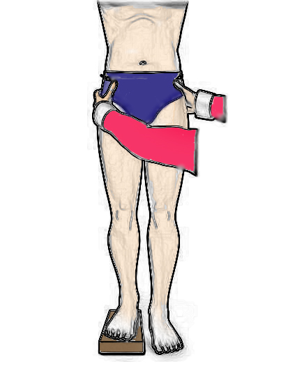 □ 기립한 후 짧은 쪽 발에 나무블록을 덧대면서 양측 엉덩이가 수평이 되는지 관찰하는 block test로도 진단할 수 있습니다.