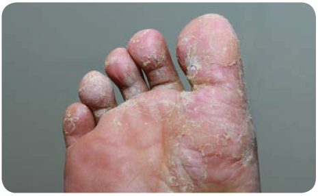 ● 족부백선과 수부백선(손발무좀)의 경우 지간형(손발가락사이형), 소수포형(물집형), 각화형(건조비늘형), 궤양형으로 분류할 수 있으며 2가지 이상이 혼합되어 나타나는 경우가 많습니다.