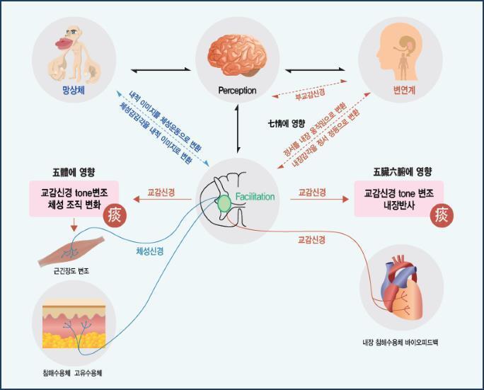 칠정은 정서정동이며, 칠정기울(七情氣鬱)은 정서정동적 스트레스라고 할 수 있다. 자율신경계, 그 중에서도 특히 교감신경은 변연계(limbic system)를 경유해 ① 칠정을 내장 움직임으로 변환시키거나, ② 내장 감각을 칠정으로 변환시킨다. 즉, 칠정과 오장육부를 동조화시키는 매개체로 교감신경이 기능하는 것이다. 칠정기울은 뇌의 통증 감수성 자체를 변화시킬 뿐만 아니라, 교감신경계의 변조를 유발해서 근골격계 통증의 잠재적 가해자가 될 수 있다.