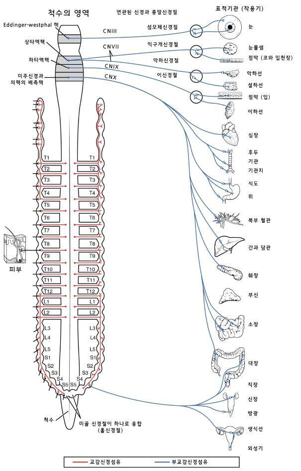- 피부의 모든 감각수용기, 침해수용기를 민감하게 한다. - 피부의 모든 작용기(땀샘, 입모근, 동맥, 정맥, 림프관, 분비선, 면역조직, 지방조직 등)는 모두 교감신경에 의해 단독 지배를 받으므로, 이러한 피부 작용기들이 과활성화된다. |