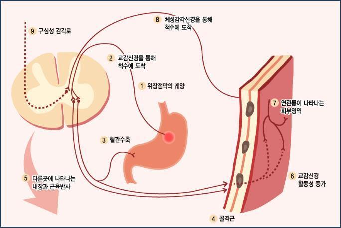 ① 위궤양(오장육부 기능부전)의 신호가 구심성 교감신경(내장 감각신경)을 통해 척수로 유입한다.