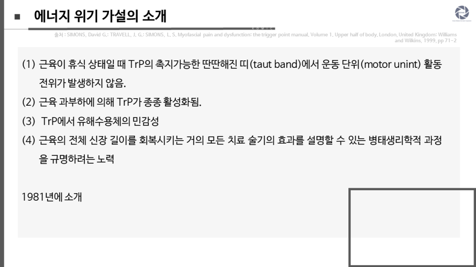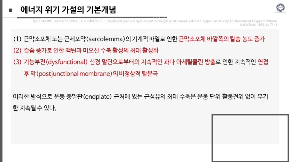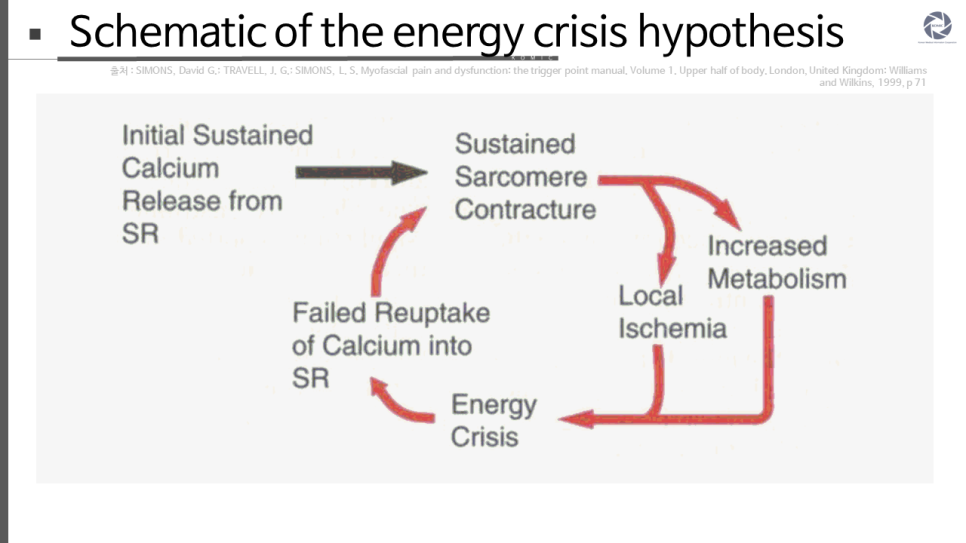 는 사실, (3) TrP에서 유해수용체의 민감성, 그리고 (4) 근육의 전체 신장 길이를 회복시키는 거의 모든 치료 술기의 효과를 설명할 수 있는 병태생리학적 과정을 규명하려는 노력으로부터 발전해왔습니다. 에너지 위기 개념은 1981년에 소개되었고 최근에 업데이트되었습니다.