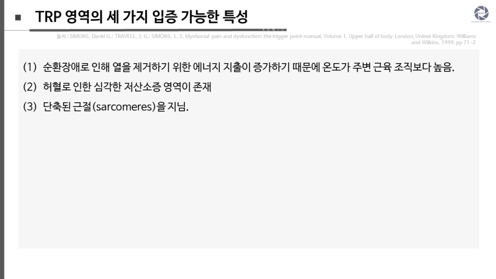 1. TrP 온도를 구체적으로 측정한 유이한(the only two) 공개된 보고서는 1954년 트라벨(Travell)의 초기 보고서와 1976년 포펠리안스키(Popelianskii) 등이 러시아어로 간략히 기술한 보고서뿐입니다. 둘 다 TrP 영역의 국소 온도 상승을 기록했습니다. 현대적 도구들과 TrP의 현행 진단기준을 사용하여 이 실험을 반복하는 것은 비교적 간단한 절차이며 매우 바람직합니다.