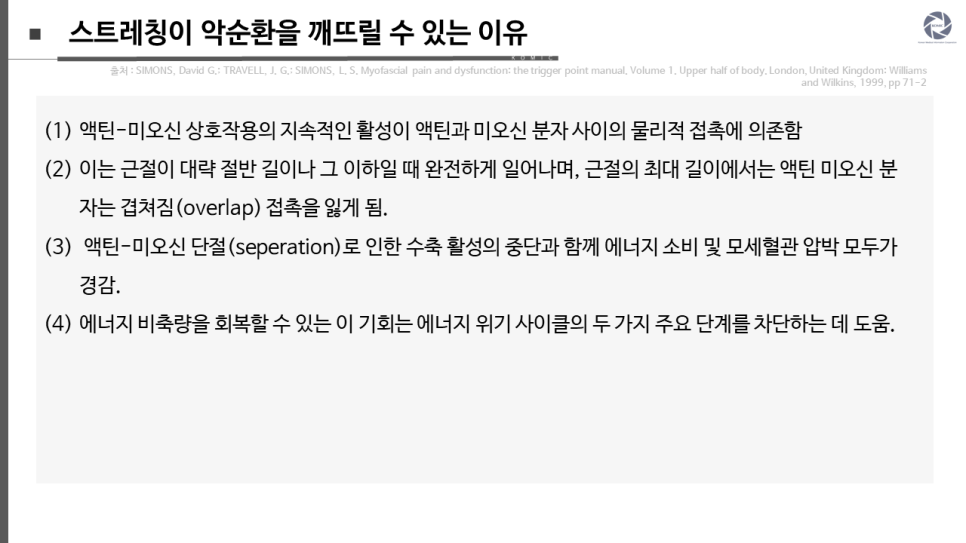 따라서, 에너지 위기 가설은 (1) 근섬유의 신경 개시 수축보다는 수축성 요소의 내인성 수축으로 인한 운동 단위 활동전위의 부족; (2) 종말판 시냅스 틈(synaptic cleft) 영역의 두드러진 기계적 취약성(vulnerability)을 반영할지도 모르는 근육 과부하가 TrP를 활성화시키는 빈도; (3) 에너지 위기로 인한 조직 곤경(distress)의 결과로서 TrP의 기능부전 종말판 부근에서 유해수용체를 감작시킬 수 있는 전달물질의 방출; (4) 짧게라도 근육의 TrP 부분을 그 최대 신장 길이까지 신장시킬 수 있으며, 그로 인해 에너지 소비 수축 활성을 포함한 악순환을 깨뜨릴 수 있는, 본질적으로 모든 술기의 효용성을 설명합니다.