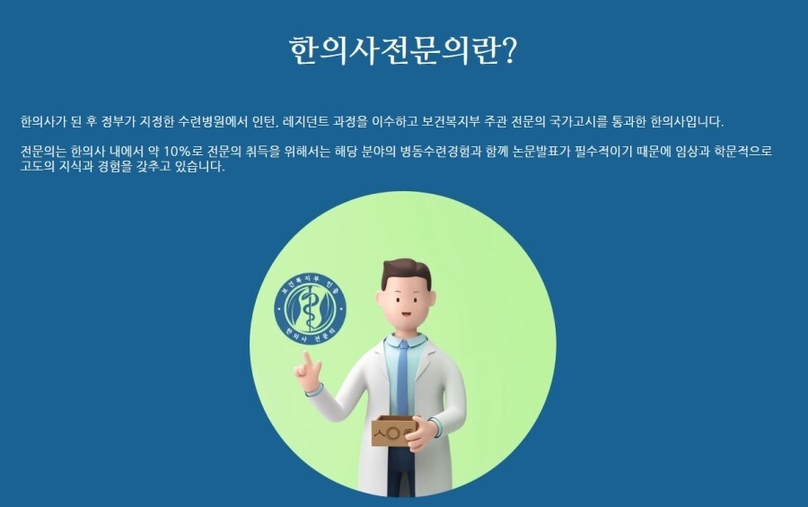 한의사 전문의란 한의사가 된 후 '정부에서 지정한 수련병원에서 인턴, 레지던트 과정을 이수하고 보건복지부 주관 전문의 국가고시를 통과한 한의사'를 말합니다.