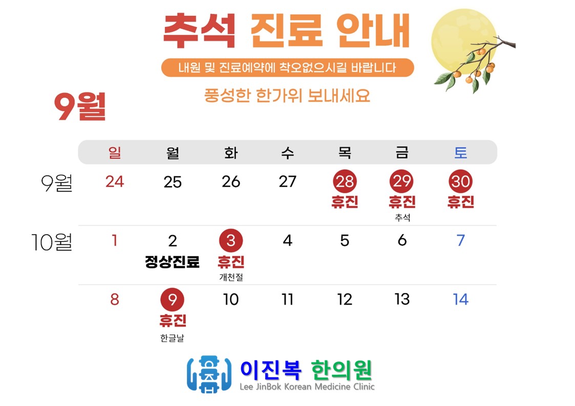 10월 2일(월) 임시 공휴일은 정상진료(오전9시~오후8시)합니다.
