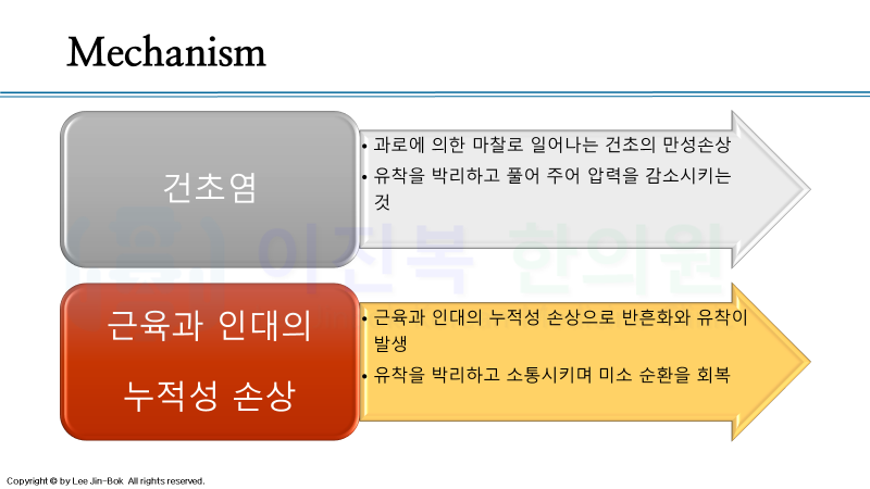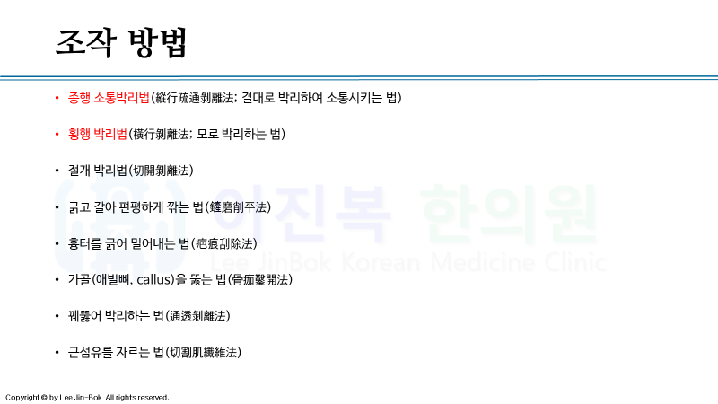 조직의 유착이 심하거나 구축된 경우에 주로 적용하고 있습니다. 염증성, 마찰 질환의 경우 우선적으로는 침도를 사용하지 않습니다.