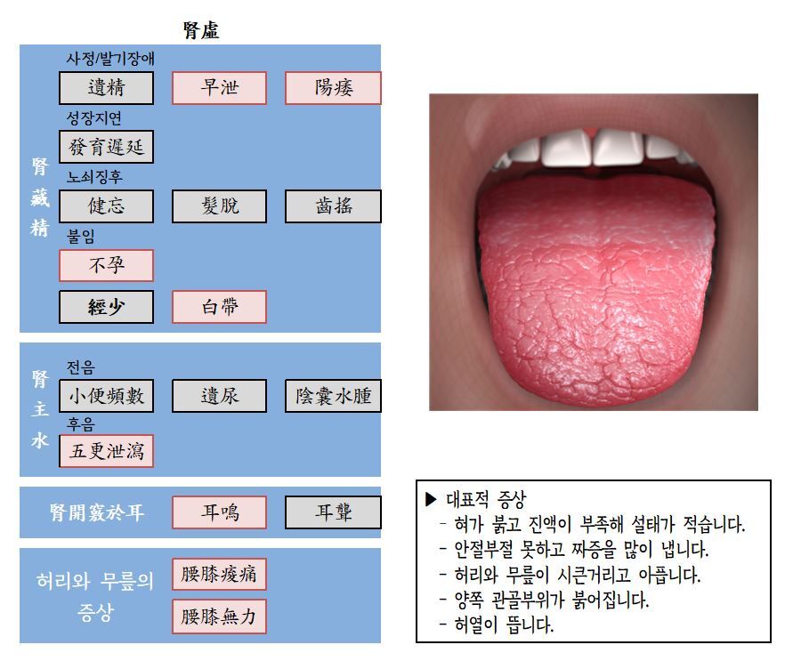 □ 신음(腎陰)에 속하는 기능이 약해지면 양열(陽熱)을 제약하지 못하여 음허내열(陰虛內熱)하게 되어 오심번열(五心煩熱), 조열(潮熱), 관홍(顴紅), 도한(盜汗), 맥세삭(脈細數), 설홍소태(舌紅少苔) 등이 나타나며, 음(陰)이 양(陽)을 제약하지 못하면 상화망동(相火妄動)으로 성욕항진, 유정(遺精), 조설(早泄) 등이 나타나게 됩니다.