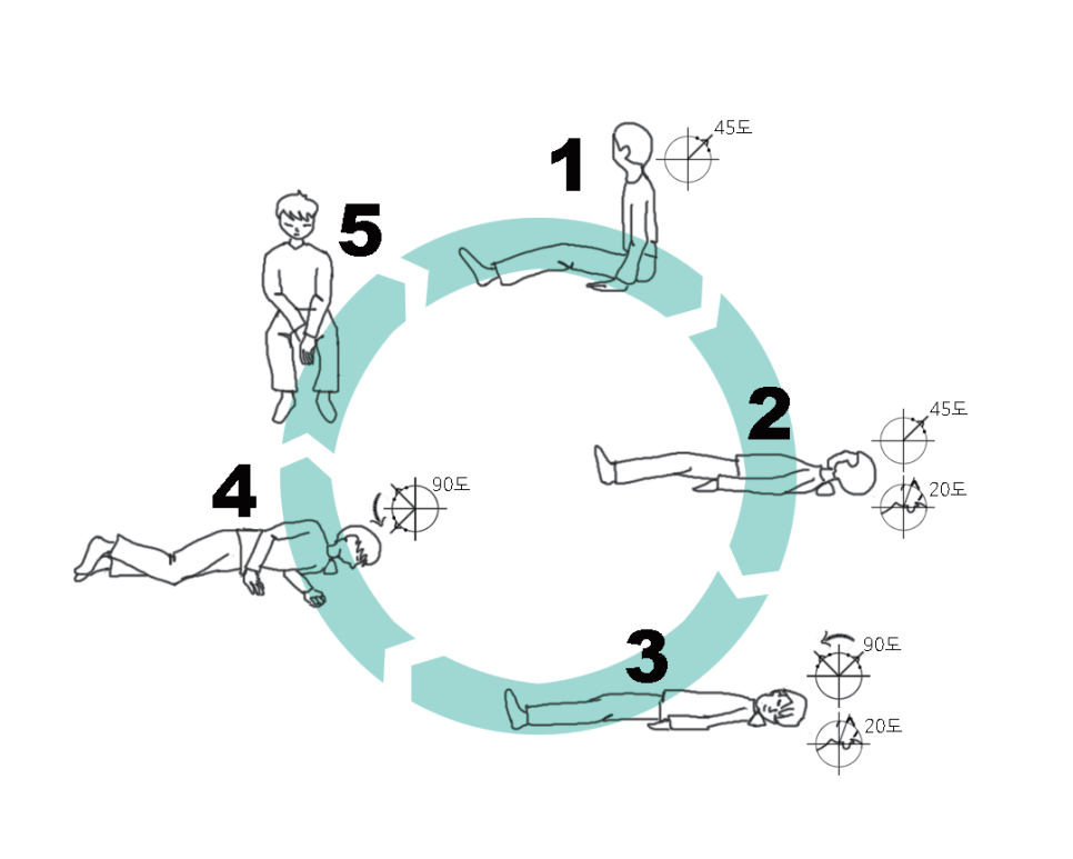 (1) 환측(우측)으로 45도 고개를 돌린 후 앙와위로 눕힙. 등에 베개를 받쳐서 고개가 20도 정도 신전되게 함