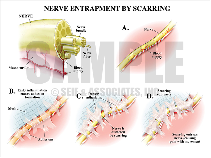 수술후 유착으로 인한 신경포착 증상은 위의 그림과 같이 수술 후 반흔 결합조직이 엉켜져 신경을 압박하여 발생한다. 신경이 압박당하면 저림, 통증, 이상감각 및 움직일때 통증이 발생하게 된다.
