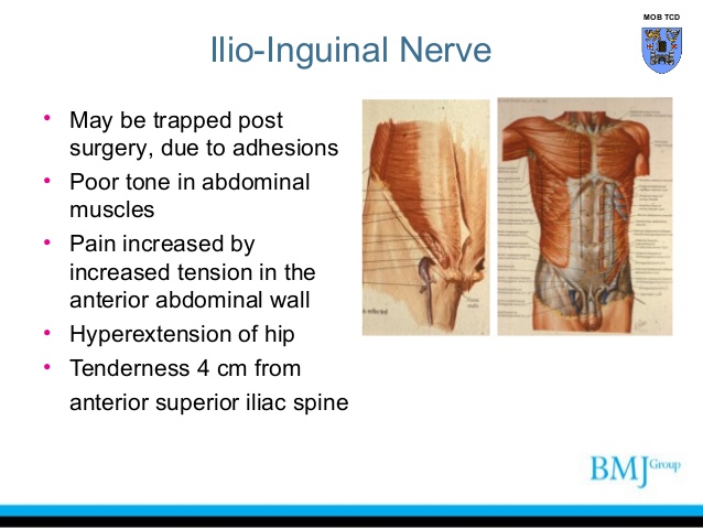 장골서혜신경의 포착시 사타구니 통증 및 음부증상 외에도 복근의 위약감이 나타난다.