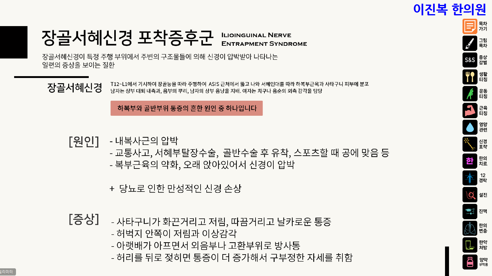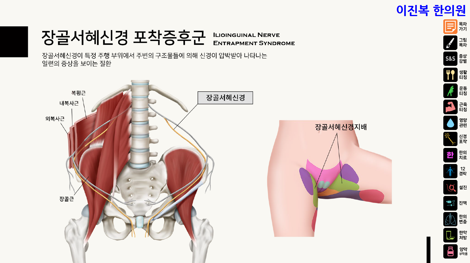 오늘은 사타구니 통증을 유발하는 질환 중 하나인 장골서혜신경 포착증후군에 대해 알아보겠습니다.