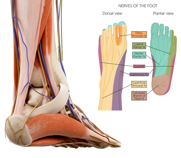 발바닥감각은 경골신경(Tibial nerve)이 발바닥으로 내려오면서 내측발바닥신경(Medial plantar nerve)와 외측발바닥신경(Lateral plantar nerve)로 나뉘어 지배합니다.
