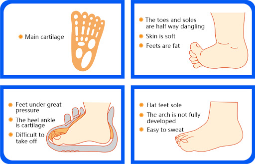 그 외에도 평발로 인해 신발 안쪽이 먼저 닳는다거나 발뒤꿈치가 바깥쪽으로 틀어지는 모양을 갖게 된다.