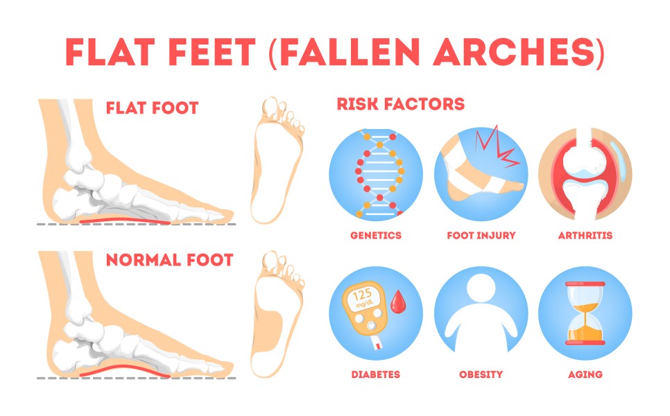 평발이 생기는 위험요인으로는 유전적 요인, 발의 외상, 관절염, 당뇨, 비만, 노화 등이 있다.