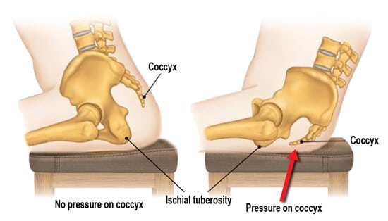 의자에 쿠션이 있을 경우 덜하지만 쿠션이 없는 딱딱한 의자일 경우 꼬리뼈 통증이 더 나타나기 쉽고, 다리를꼬거나, 허리가 틀어지게 삐딱하게 앉는 경우 한쪽 엉덩이로 체중이 쏠려서, 꼬리뼈 통증이 심해질 수 있습니다.