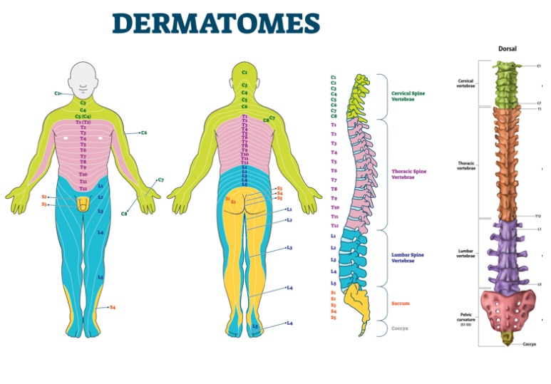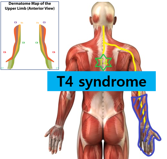 흉추4번(T4) 분절에 문제가 생기면 팔 전체 혹은 전완부 전체에 저림, 시림, 화끈거림, 따끔거림 등의 이상감각이 나타나고 dermatome을 벗어나 증상이 생기는 것을 말합니다.