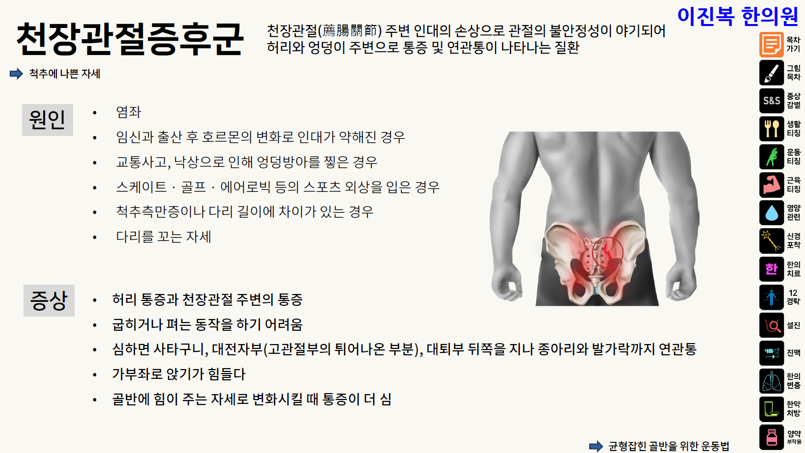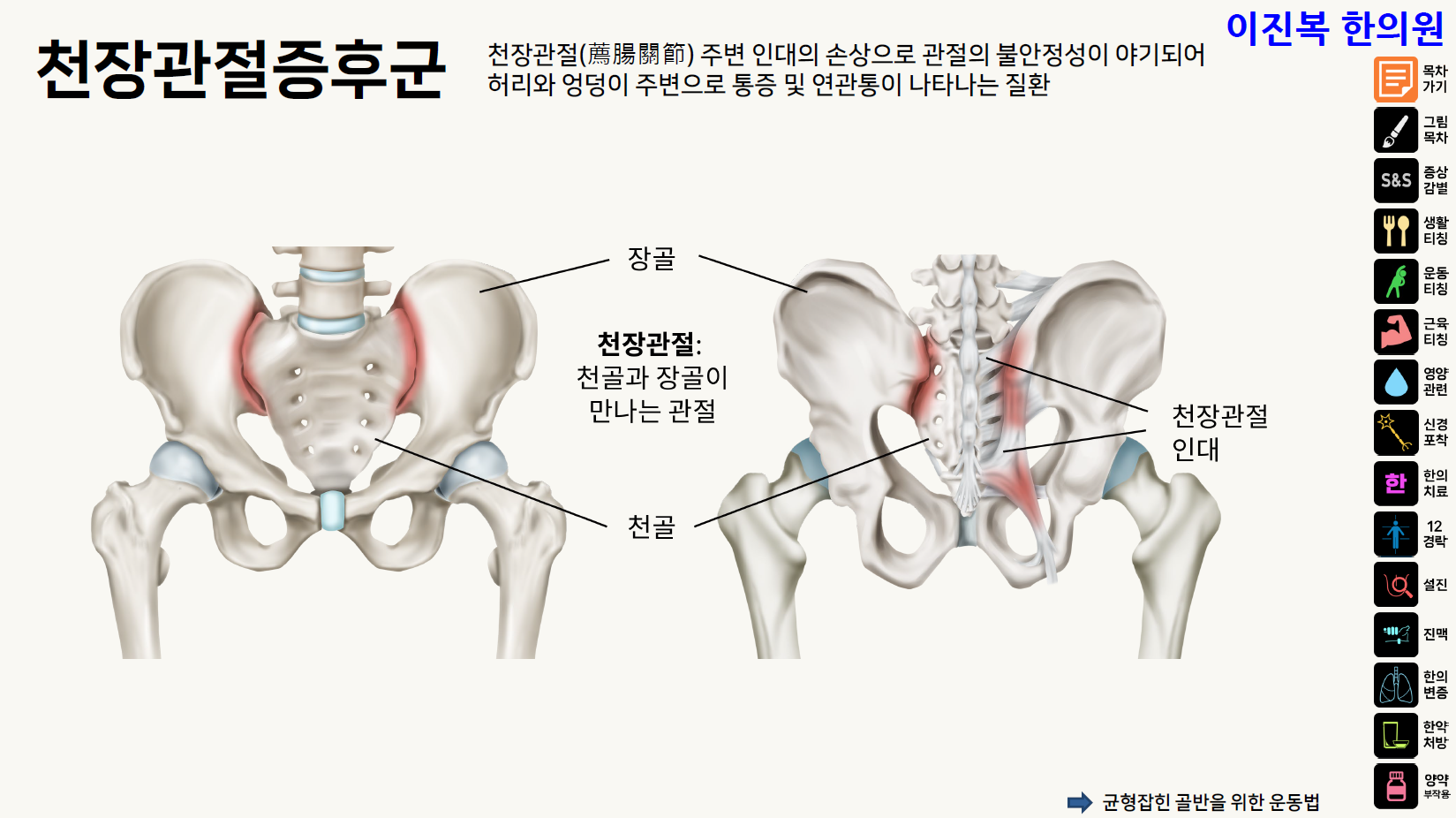 오늘은 허리와 골반의 통증을 유발하는 천장관절 증후군에 대해 알아 보겠습니다.