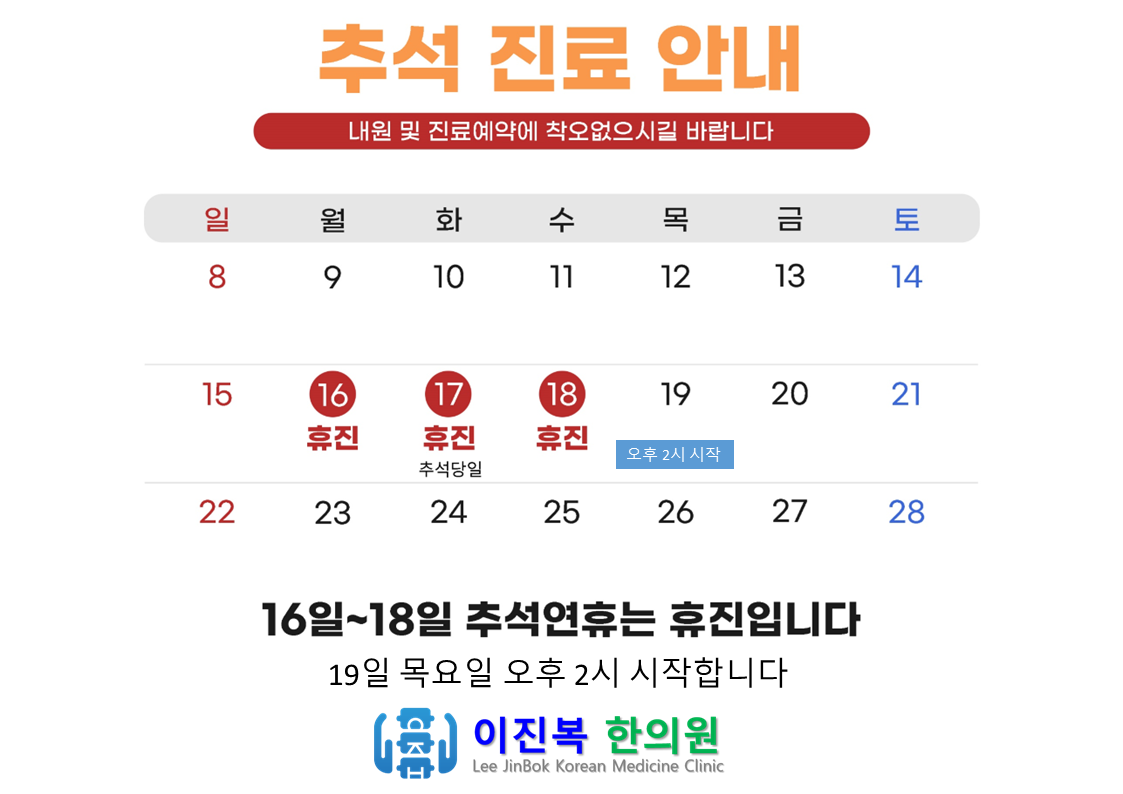 이번 추석 명절 이진복한의원 진료 시간 안내해 드립니다.